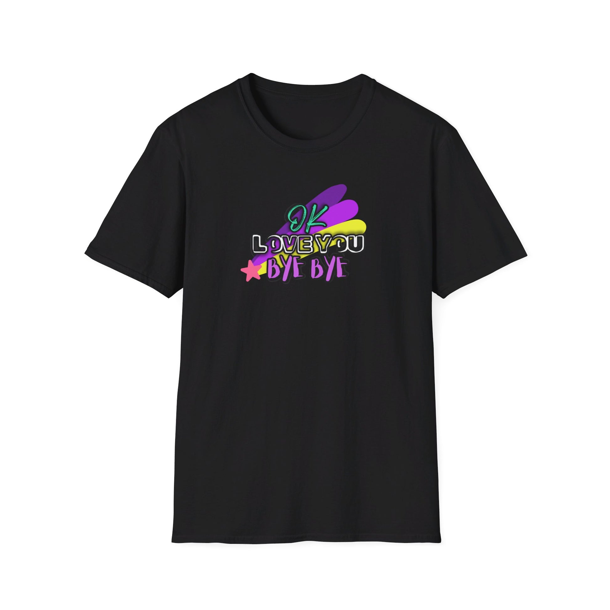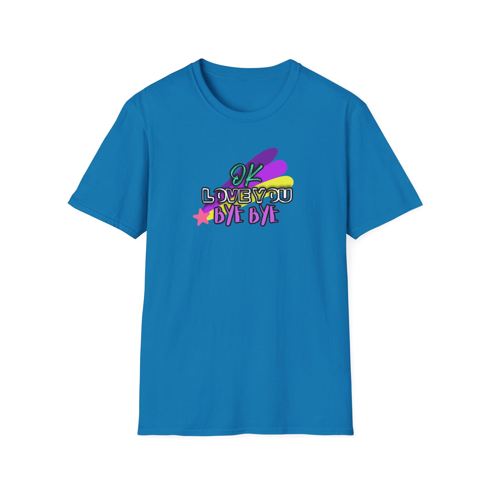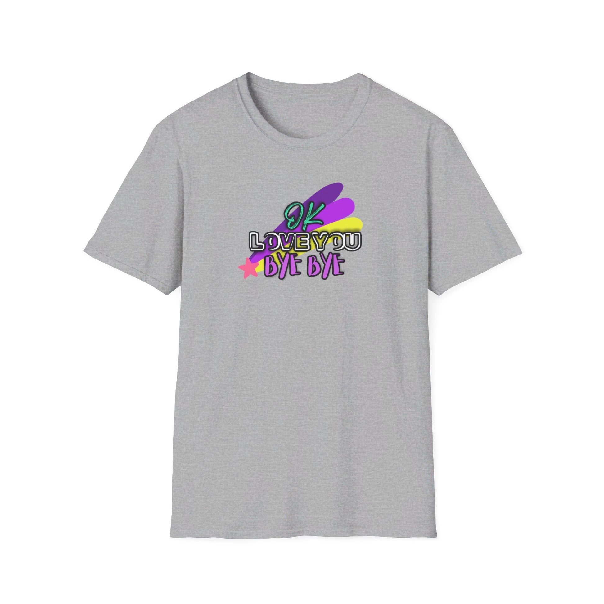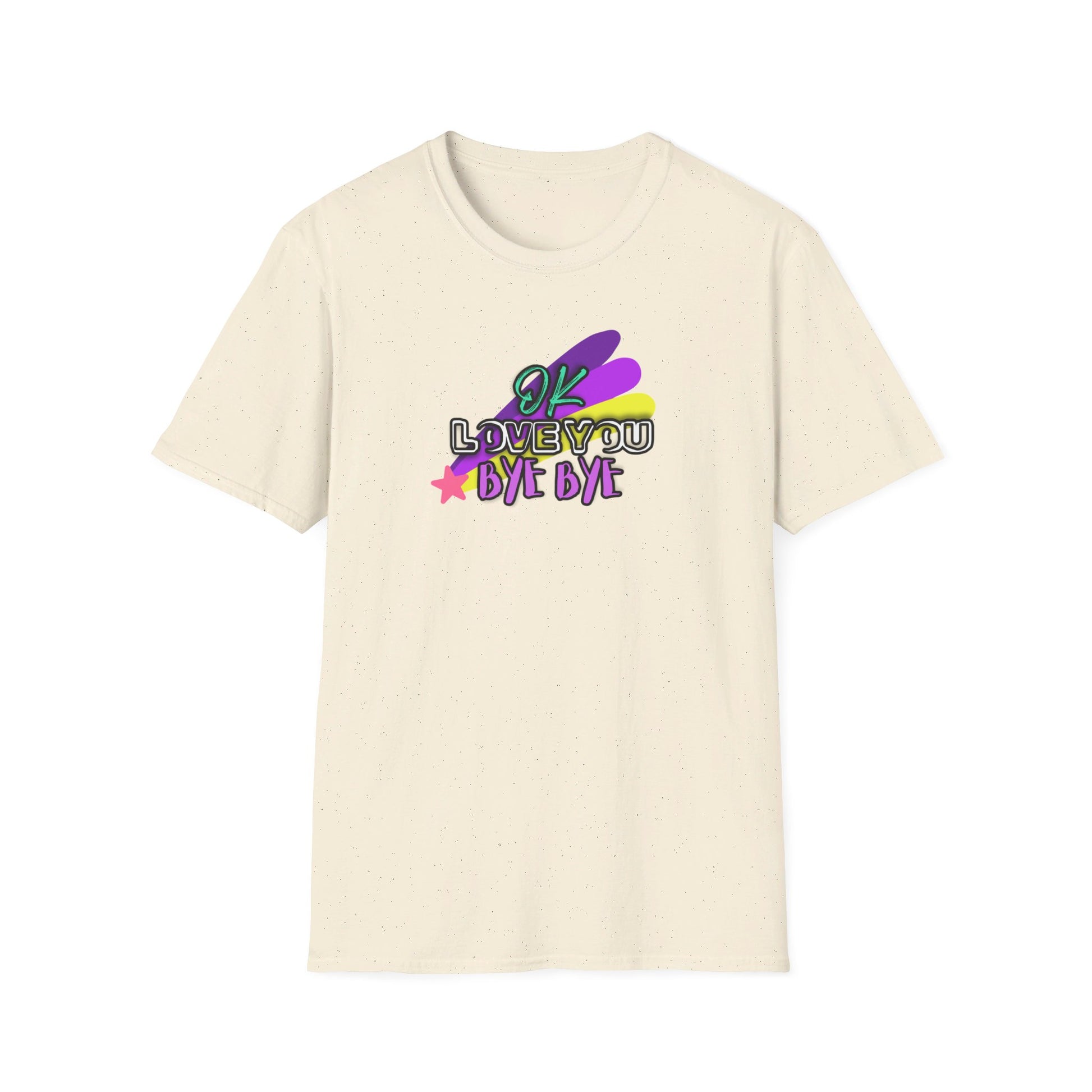 Whether you're saying a quick goodbye or just spreading positive vibes, this t-shirt is sure to bring a smile to everyone’s face. Add a touch of whimsy and heartfelt charm to your wardrobe with our "OK Love You Bye Bye" T-shirt!